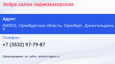 Зебра, салон-парикмахерская по адресу 460052, Оренбургская область, Оренбург, Джангильдина, 9 в дальнейшем Организация, размещена в следующих категориях: