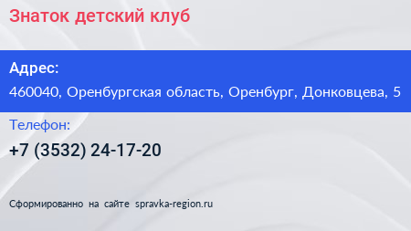 Знаток, детский клуб по адресу 460040, Оренбургская область, Оренбург, Донковцева, 5 в дальнейшем Организация, размещена в следующих категориях: