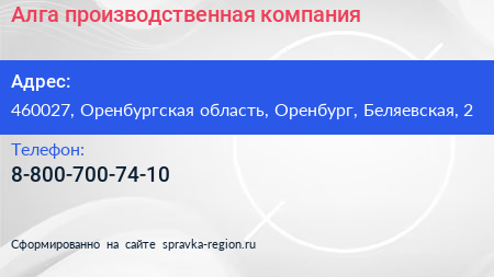 Алга, производственная компания по адресу 460027, Оренбургская область, Оренбург, Беляевская, 2 в дальнейшем Организация, размещена в следующих категориях: