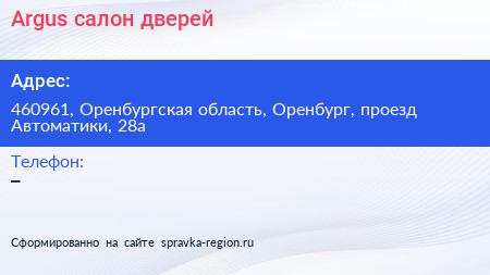 Argus, салон дверей по адресу 460961, Оренбургская область, Оренбург, проезд Автоматики, 28а в дальнейшем Организация, размещена в следующих категориях: