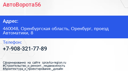АвтоВорота56 по адресу 460048, Оренбургская область, Оренбург, проезд Автоматики, 8 в дальнейшем Организация, размещена в следующих категориях: