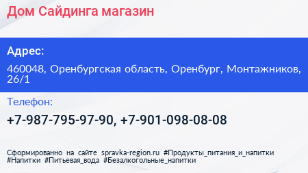 Дом Сайдинга, магазин по адресу 460048, Оренбургская область, Оренбург, Монтажников, 26/1 в дальнейшем Организация, размещена в следующих категориях: