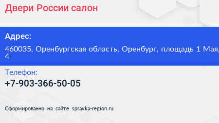Двери России, салон по адресу 460035, Оренбургская область, Оренбург, площадь 1 Мая, 4 в дальнейшем Организация, размещена в следующих категориях: