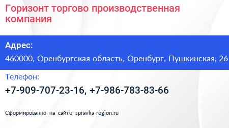 Горизонт, торгово-производственная компания по адресу 460000, Оренбургская область, Оренбург, Пушкинская, 26 в дальнейшем Организация, размещена в следующих категориях: