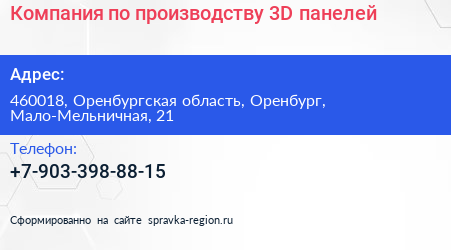 Компания по производству 3D-панелей по адресу 460018, Оренбургская область, Оренбург, Мало-Мельничная, 21 в дальнейшем Организация, размещена в следующих категориях: