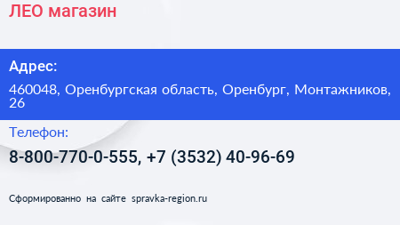 ЛЕО, магазин по адресу 460048, Оренбургская область, Оренбург, Монтажников, 26 в дальнейшем Организация, размещена в следующих категориях: