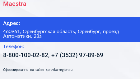 Maestra по адресу 460961, Оренбургская область, Оренбург, проезд Автоматики, 28а в дальнейшем Организация, размещена в следующих категориях: