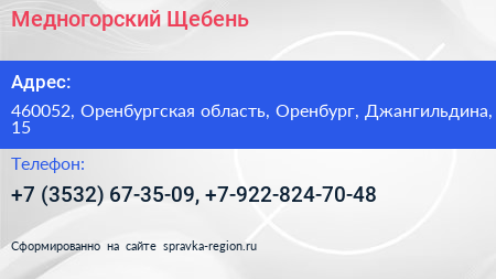 Медногорский Щебень по адресу 460052, Оренбургская область, Оренбург, Джангильдина, 15 в дальнейшем Организация, размещена в следующих категориях:
