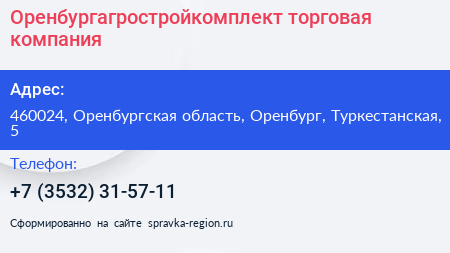 Оренбургагростройкомплект, торговая компания по адресу 460024, Оренбургская область, Оренбург, Туркестанская, 5 в дальнейшем Организация, размещена в следующих категориях: