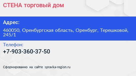 СТЕНА, торговый дом по адресу 460050, Оренбургская область, Оренбург, Терешковой, 245/1 в дальнейшем Организация, размещена в следующих категориях: