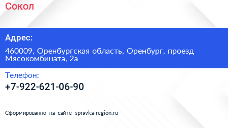 Сокол по адресу 460009, Оренбургская область, Оренбург, проезд Мясокомбината, 2а в дальнейшем Организация, размещена в следующих категориях: