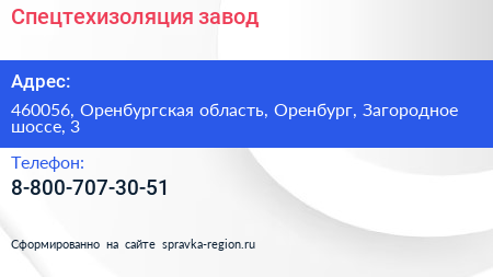 Спецтехизоляция, завод по адресу 460056, Оренбургская область, Оренбург, Загородное шоссе, 3 в дальнейшем Организация, размещена в следующих категориях: