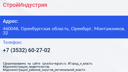 СтройИндустрия по адресу 460048, Оренбургская область, Оренбург, Монтажников, 32 в дальнейшем Организация, размещена в следующих категориях: