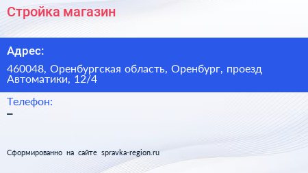 Стройка, магазин по адресу 460048, Оренбургская область, Оренбург, проезд Автоматики, 12/4 в дальнейшем Организация, размещена в следующих категориях: