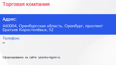 Торговая компания по адресу 460004, Оренбургская область, Оренбург, проспект Братьев Коростелёвых, 52 в дальнейшем Организация, размещена в следующих категориях: