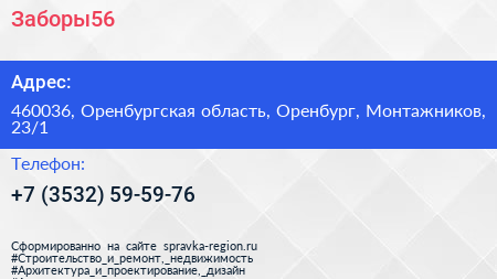 Заборы56 по адресу 460036, Оренбургская область, Оренбург, Монтажников, 23/1 в дальнейшем Организация, размещена в следующих категориях: