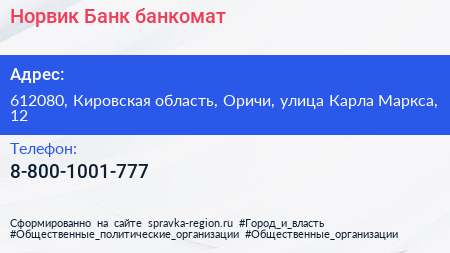 Норвик Банк, банкомат по адресу 612080, Кировская область, Оричи, улица Карла Маркса, 12 в дальнейшем Организация, размещена в следующих категориях: