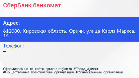 СберБанк, банкомат по адресу 612080, Кировская область, Оричи, улица Карла Маркса, 14 в дальнейшем Организация, размещена в следующих категориях: