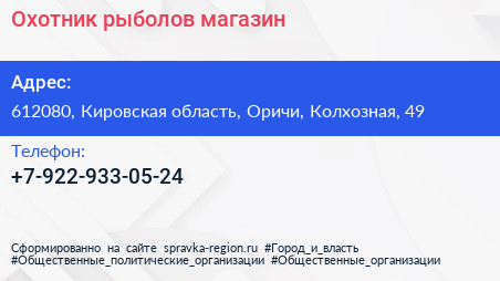 Охотник, рыболов, магазин по адресу 612080, Кировская область, Оричи, Колхозная, 49 в дальнейшем Организация, размещена в следующих категориях: