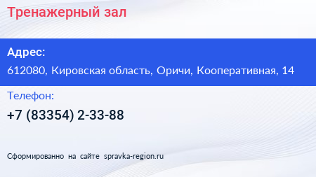 Тренажерный зал по адресу 612080, Кировская область, Оричи, Кооперативная, 14 в дальнейшем Организация, размещена в следующих категориях: