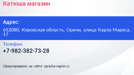 Катюша, магазин по адресу 612080, Кировская область, Оричи, улица Карла Маркса, 17 в дальнейшем Организация, размещена в следующих категориях: