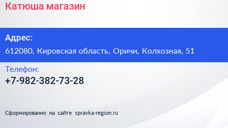 Катюша, магазин по адресу 612080, Кировская область, Оричи, Колхозная, 51 в дальнейшем Организация, размещена в следующих категориях:
