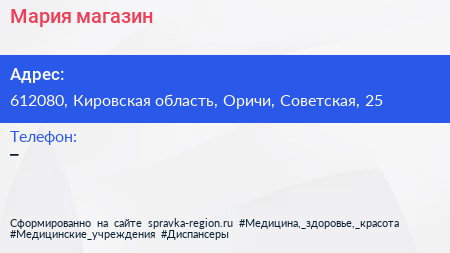 Мария, магазин по адресу 612080, Кировская область, Оричи, Советская, 25 в дальнейшем Организация, размещена в следующих категориях: