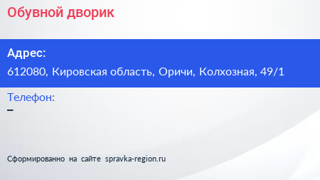 Обувной дворик по адресу 612080, Кировская область, Оричи, Колхозная, 49/1 в дальнейшем Организация, размещена в следующих категориях: