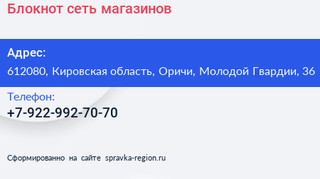 Блокнот, сеть магазинов по адресу 612080, Кировская область, Оричи, Молодой Гвардии, 36 в дальнейшем Организация, размещена в следующих категориях: