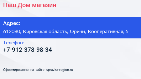 Наш Дом, магазин по адресу 612080, Кировская область, Оричи, Кооперативная, 5 в дальнейшем Организация, размещена в следующих категориях: