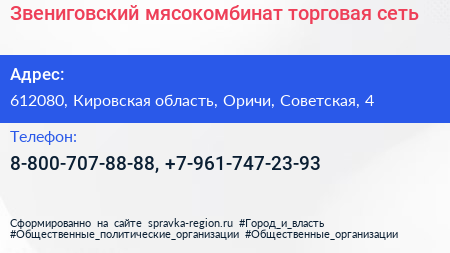 Звениговский мясокомбинат, торговая сеть по адресу 612080, Кировская область, Оричи, Советская, 4 в дальнейшем Организация, размещена в следующих категориях: