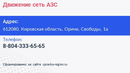 Движение, сеть АЗС по адресу 612080, Кировская область, Оричи, Свободы, 1а в дальнейшем Организация, размещена в следующих категориях: