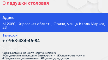 О`ладушки, столовая по адресу 612080, Кировская область, Оричи, улица Карла Маркса, 23 в дальнейшем Организация, размещена в следующих категориях: