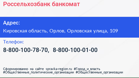 Россельхозбанк, банкомат по адресу Кировская область, Орлов, Орловская улица, 109 в дальнейшем Организация, размещена в следующих категориях: