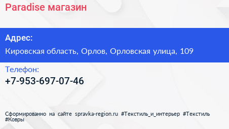 Paradise, магазин по адресу Кировская область, Орлов, Орловская улица, 109 в дальнейшем Организация, размещена в следующих категориях: