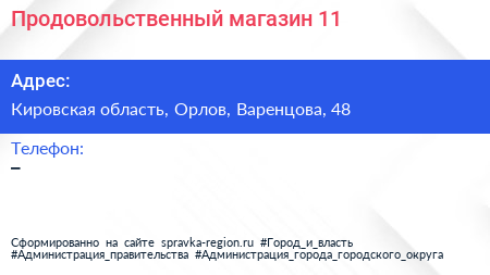 Продовольственный магазин №11 по адресу Кировская область, Орлов, Варенцова, 48 в дальнейшем Организация, размещена в следующих категориях: