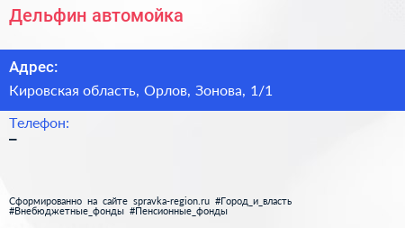 Дельфин, автомойка по адресу Кировская область, Орлов, Зонова, 1/1 в дальнейшем Организация, размещена в следующих категориях: