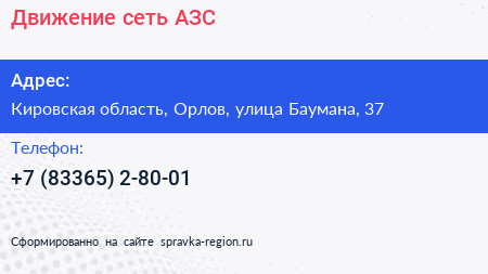Движение, сеть АЗС по адресу Кировская область, Орлов, улица Баумана, 37 в дальнейшем Организация, размещена в следующих категориях: