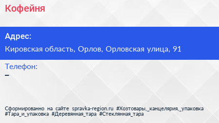 Кофейня по адресу Кировская область, Орлов, Орловская улица, 91 в дальнейшем Организация, размещена в следующих категориях: