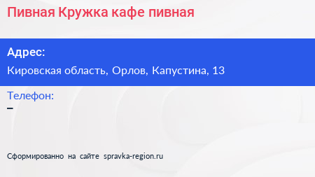 Пивная Кружка, кафе-пивная по адресу Кировская область, Орлов, Капустина, 13 в дальнейшем Организация, размещена в следующих категориях: