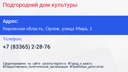 Подгородний дом культуры по адресу Кировская область, Орлов, улица Мира, 1 в дальнейшем Организация, размещена в следующих категориях: