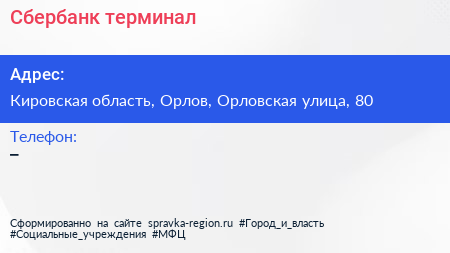 Сбербанк, терминал по адресу Кировская область, Орлов, Орловская улица, 80 в дальнейшем Организация, размещена в следующих категориях: