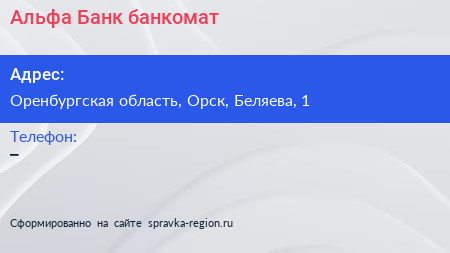 Альфа-Банк, банкомат по адресу Оренбургская область, Орск, Беляева, 1 в дальнейшем Организация, размещена в следующих категориях: