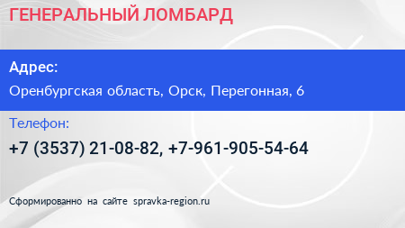 ГЕНЕРАЛЬНЫЙ ЛОМБАРД по адресу Оренбургская область, Орск, Перегонная, 6 в дальнейшем Организация, размещена в следующих категориях: