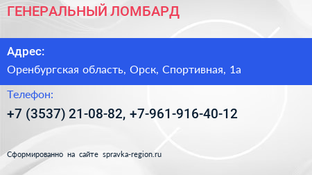 ГЕНЕРАЛЬНЫЙ ЛОМБАРД по адресу Оренбургская область, Орск, Спортивная, 1а в дальнейшем Организация, размещена в следующих категориях: