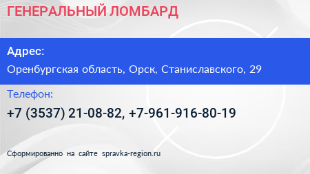 ГЕНЕРАЛЬНЫЙ ЛОМБАРД по адресу Оренбургская область, Орск, Станиславского, 29 в дальнейшем Организация, размещена в следующих категориях: