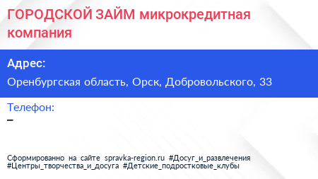 ГОРОДСКОЙ ЗАЙМ, микрокредитная компания по адресу Оренбургская область, Орск, Добровольского, 33 в дальнейшем Организация, размещена в следующих категориях: