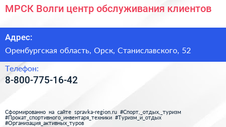 МРСК Волги, центр обслуживания клиентов по адресу Оренбургская область, Орск, Станиславского, 52 в дальнейшем Организация, размещена в следующих категориях: