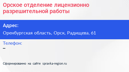 Орское, отделение лицензионно-разрешительной работы по адресу Оренбургская область, Орск, Радищева, 61 в дальнейшем Организация, размещена в следующих категориях: