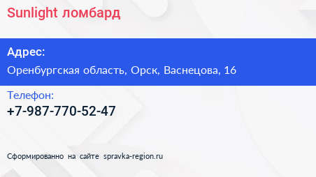 Sunlight, ломбард по адресу Оренбургская область, Орск, Васнецова, 16 в дальнейшем Организация, размещена в следующих категориях: